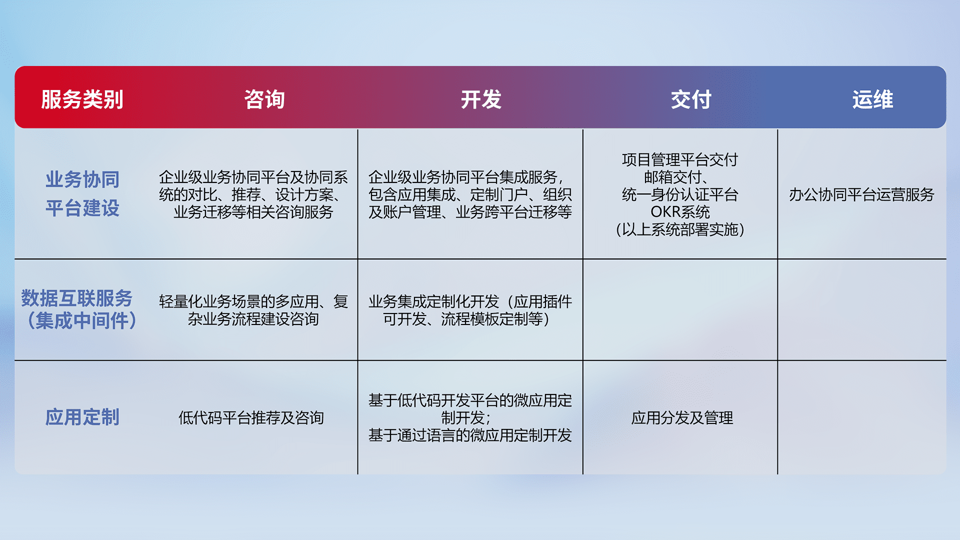 针对钉钉、、、企微、、IDaas等平台级产品提供产品的规划、、、、方案、、、交付、、定制化开发等服务,,,,实现如统一协同办公、、智能客户服务、、、、混合会议管理、、、、智能数据查询、、、等业务场景,,,实现数字化转型。。。